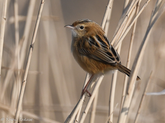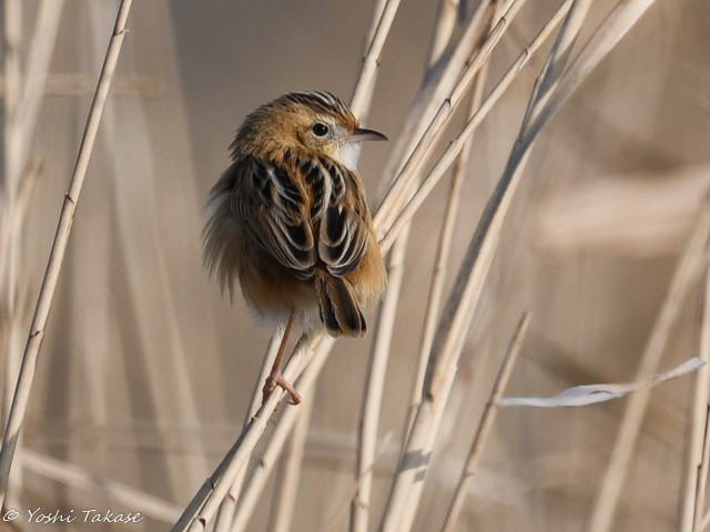 The zitting cisticola immediately hid in the reed bushes, but reappeared an hour later. Zitting cisticola is a small bird that is smaller than the sparrow, so it stops lightly on reeds. It is funny to see the zitting cisticola perching on two reeds with each foot on different stem.