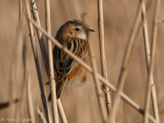 セッカはすぐ葦の茂みに姿を隠したが、1時間位後にまた姿を見せた。セッカはスズメより小さい小鳥なので葦に軽々と止まる。セッカが2本の葦にまたがって止まる姿勢はなんとなくおかしい。